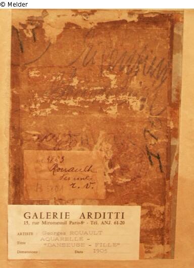 Maßangabe mit Rahmen (Sizes with frame); signiert (signature): "G.Rouault 1905"; Aufschriften und Aufkleber der Rückseite (on reverse labels): "GALERIE ARDITTI, 15, Rue Miromesnil Paris 8 e, Artiste: Georges Rouault, Titre: AQUARELLE-DANSEUSE-FILLE, Date: 1905"; "No 5863 Rouault"; mit Bleistift (with pencil): "B 5801"; Stempel (stamp): "DOUAN..." or "DOLLAN..." (?); mit Pastellstift (with pastel): "11"; mit Bleistift (with pencil): "Eigentum Flechtheim" (?); mit Pastellstift (with pastel): "DI"
