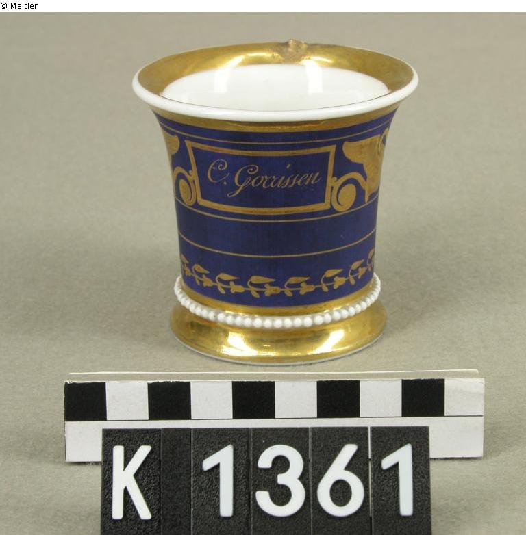 Eine ganz in Dunkelblau und Gold verzierte Tasse, deren Henkel fast ganz abgebrochen ist. Gegenüber dem Henkelrest ist im oberen Drittel in einem goldenen Rahmen der Name 'C. Goaissen' (?) in Gold auf Blau in Schreibschrift geschrieben. Rechts und links je ein großer Vogel (Schwan?) mit Blattgirlanden im Schnabel, über den Girlanden 2 goldfarbene Gebilde (Musikinstrumente). Weiter unten auf dem dunkelblauen Untergrund eine stilisierte Blütengirlande rings herum, darunter auf dem goldenen Fußsockel ein dichter Kranz weißer Porzellanperlen.