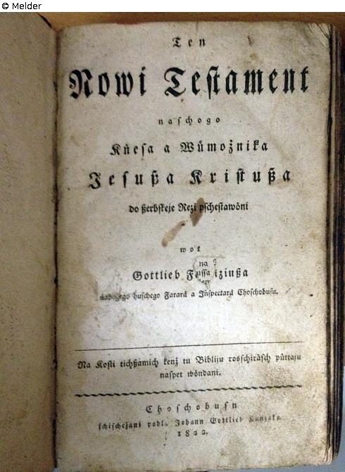 Fundmeldung | Einzelobjekt Ten Nowi Testament naschogo Kňesa a Wůmożnika Jasußa Kristußa do ßerbskeje Rezi pschestawŏni Lost Art-ID567268 Vorherige Weiter Herausgeber Gottlieb F[...]iziuß (Übersetzer) Verlag Johann Gottlieb Kunzak TitelTen Nowi Testament naschogo Kňesa a Wůmożnika Jasußa Kristußa do ßerbskeje Rezi pschestawŏniErscheinungsortChoschobusu [= Cottbus] Erscheinungsdatum1822ObjektartBuchObjektgruppeBibliotheksgutSignaturB 372Beschreibung Provenienzmerkmale: unleserlich, teilweise getilgt Weiterlesen Weniger anzeigen Provenienz 1998 Eingang in die Sammlung (Ankauf) von [Namen bekannt]; zuvor: unbekannt Weiterlesen Weniger anzeigen Veröffentlicht seit20.04.2017 Kontakt Stadt- und Regionalmuseum Lübben Ernst-von-Houwald-Damm 14 15907 Lübben Deutschland Tel 03546 187478E-Mailmuseum@luebben.deHomepagehttp://www.museum-luebben.de Ansprechpartner:in Dr. C. JunkerPositionMuseumsleiterinE-Mailmuseum@luebben.de