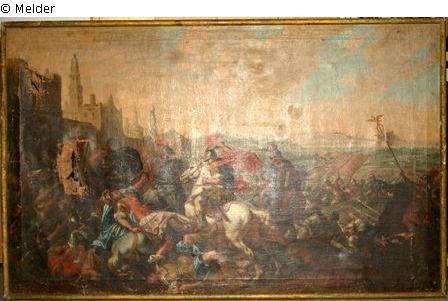 Schlachtenszene vor antiker Stadtsilhouette. Mittig ein Reiter in römischer Rüstung tötet einen links von ihm auf gestürztem Pferd liegenden Soldaten mit der Lanze. Rechts außen ein römischer Soldat ins Bild reitend mit Legionsstandarte.