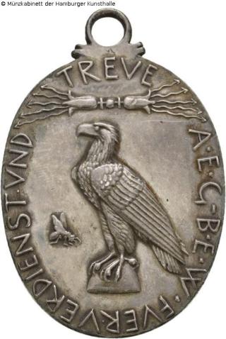 Vorderseite: Brustbild des Emil Rathenau nach links. Unten die Signatur H. HAHN, Legende: EMIL RATHENAV LXX IAHRE ALT XI DEZ MCMVIII; Rückseite: Ein Adler steht mit angelegten Schwingen auf einer Freiheitskappe (pilus) nach links. Über ihm ein Blitzbündel. Im linken Feld eine Grille/Heuschrecke, Legende: A E G B E W FVER VERDIENST VND - TREVE; guter Zustand.