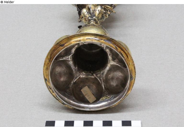 Silberner Akeleipokal (vergoldet) mit vasenförmigem Schaft und jeweils sechs Buckeln im Deckel, der Kuppa, dem Schaft und dem Fuß. Auf dem Deckel befindet sich ein Blumenstrauß, am Ablauf und am Fuß Blattwerk aus Weißsilber. Der Fuß des Pokals wurde vermutlich im 19. Jahrhundert ergänzt, da es sich hierbei wahrscheinlich um eine Augsburger Arbeit aus der zweiten Hälfte des 17. Jahrhunderts handelt. Auf ihm sind als Marken wohl ein Pinienzapfen und eine unbekannte Meistermarke HO vorhanden. Möglicherweise wurde der Fuß ursprünglich als Deckel eines anderen Pokals genutzt. Beim oberen Teil handelt es sich hingegen eindeutig um eine Nürnberger Arbeit. Das Beschauzeichen stammt vermutlich aus der Zeit zwischen 1609 und 1629. Die Meistermarke dürfe Hans Beutmüller zuzuordnen sein, der 1622 verstorben ist. Unter dem Fuß befindet sich ein aufgeklebtes Etikett mit der Nr. 12640.