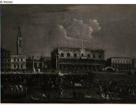 Blick auf die Piazetta von Süden. Rechts der ogenpalast und die Riva die die Schiavone. Links die Bibliothek, dahinter der Campanile. Auf der Lagune Gondeln.