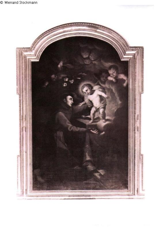 Auf dem Gemälde ist eine Vision des heiligen Antonius dargestellt: Christus als Knabe erscheint dem zum Gebet knieenden Heiligen auf einem Altartisch. Der Kopf des Christ-Kindes ist von einer strahlenden Gloriole umgeben. Darüber befindet sich ein Reigen aus geflügelten Putten von Wolken umgeben, weiße Lilien streuend. Im Vordergrund links befindet sich ein aufgeschlagenes Buch, welches die ästhetische Grenze des Gemäldes in den Betrachter-Raum zu überschreiten scheint.