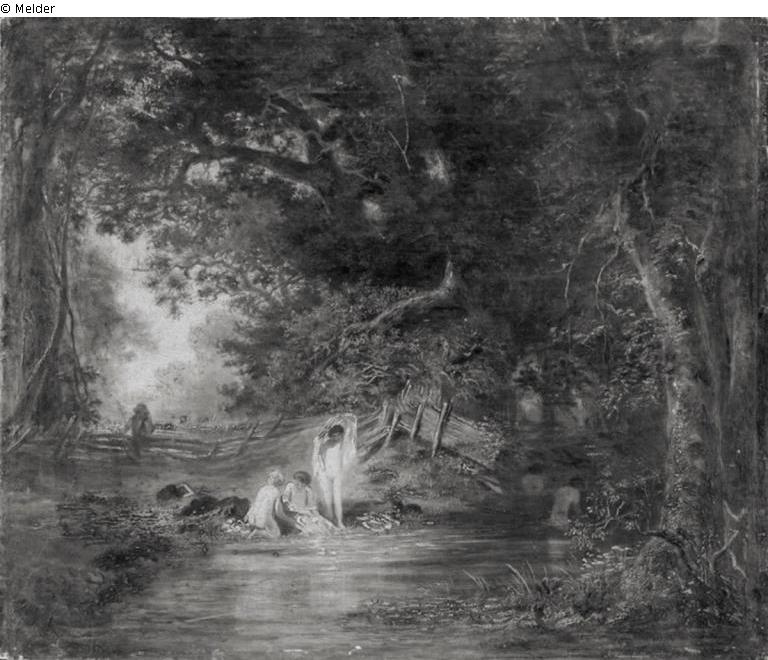 In einem aus alten Laubbäumen gebildeten Hochwald baden an einem Bad oder Teich drei junge Mädchen. Eine von ihnen sitzt auf dem Boden, eine zweite steht und ist im Begrifft ihr Hemd anzulegen, die dritte kniet und schaut sich nach einem Hirten um, der links hintern aus einer Lichtung heraustritt. Quer durch diese Lichtung läuft ein Zaun. Hinter dem Mädchen abgelegte Kleider. An der rechten Bildkante als Repoussoir ein Stamm eines alten Baumes.