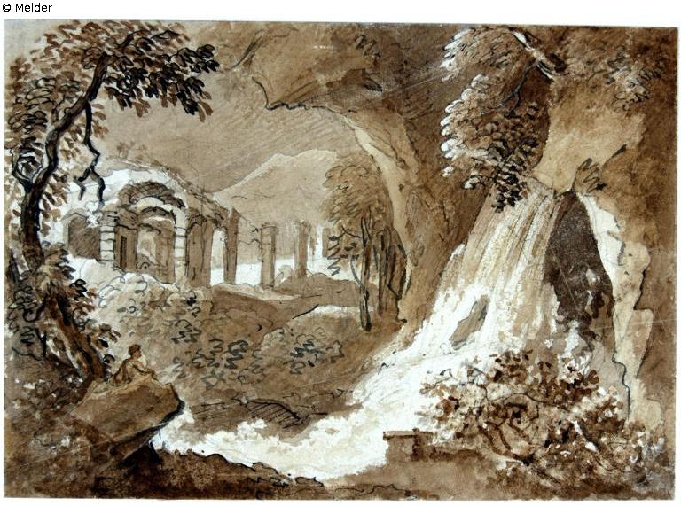 Wasserfall neben Ruinen, vorn links Beobachter