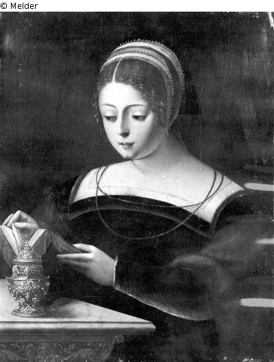 Fundmeldung | Einzelobjekt Weibliche Halbfigur mit Buch und Vase (Magdalena) Lost Art-ID220977 Vorherige Weiter Hersteller/Künstler:in Meister mit dem Papagei WirkungsortAntwerpen, BrüsselErste Erwähnung1501/1533 TitelWeibliche Halbfigur mit Buch und Vase (Magdalena)ObjektartMalereiObjektgruppeMalereiMaterial / TechnikÖl ; Holz / gemalt Höhe 48,50 cm Breite 38,00 cm Inventarnummermü9635Beschreibung Dame sitzt nach halblinks, in Händen Buch. Auf Tisch eine Vase m. Renaissanceornamenten. Weiterlesen Weniger anzeigen Bestand Kulturgüter aus dem ehemaligen ReichsvermögenProvenienz Zugang 1944 Weiterlesen Weniger anzeigen Veröffentlicht seit2001 Kontakt Kunstverwaltung des Bundes Herbert-Bayer-Straße 5 13086 Berlin Deutschland E-Mailprovenienzforschung@kvdb.bund.deHomepagehttp://www.kunstverwaltung.bund.de