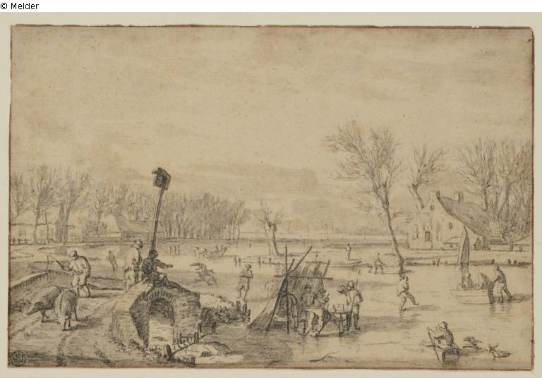 Winterlandschaft mit zugefrorenem See auf dem Personen Schlittschuh laufen, links Bauer mit zwei Schweinen auf einer Steinbrücke, rechts hinten ein Bauernhaus, mittig Unterstand auf dem Eis
