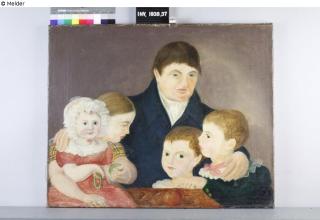 Das Gemälde zeigt einen Vater mit seinen Kindern an einem Tisch. Der Tisch bildet den unteren Rand des Gemäldes. Während der Vater zu sitzen scheint, haben seine drei größeren Kinder eng neben ihm stehend oder direkt vor ihm Platz gefunden. Das kleinste Kind sitzt vorn links im Bild auf der Tischplatte und wird von der dahinter stehenden, ältesten Tochter locker umfangen. Der älteste Sohn steht rechts im Bild. Er hat seinen Arm auf die Tischplatte gelegt und zeigt auf einen, auf dem Tisch liegenden Apfel. Die Dargestellten tragen bürgerliche Kleidung.