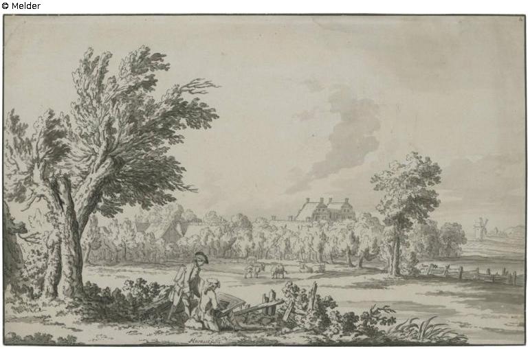 Zwei Zeichner an einer Wiese mit Kühen verweilend, im Hintergrund ein Gutshaus.