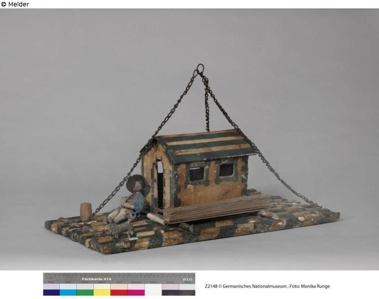 13 braun gefasste, nebeneinander angeordnete Holzstäbe werden von vier Querhölzern gehalten und bilden das eigentliche Floß. Darauf steht eine Hütte mit Satteldach. Die Bemalung suggeriert ein Steingebäude mit verputzten Wänden und nebeneinander angeordneten Dachlatten als oberer Abschluss. Das Gebäude hat vier Fenster, von denen eines verglast ist. Vor der Tür liegt ein Bärtiger Mann in Form einer bekleideten Gliederpuppe aus Holz. Auf seinen Beinen steht ein Hund (Pudel?). Der Mann trägt einen Filzhut, Hemd, Halstuch, Jacke sowie eine lederne Kniebundhose. Die Kniestrümpfe und Schuhe sind aufgemalt. neben dem Mann liegt ein kleines Holzfass sowie eine hölzerne Röhre auf die weißes Garn gewickelt ist. Erhebliche Farbabplatzungen am Floß, massive Verschmutzung.
