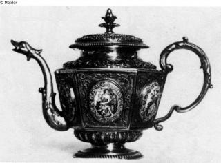 Suchmeldung Teekanne Hersteller/Künstler:in Baur, Tobias (1660) Objektart Kunsthandwerk / -gewerbe Material / TechnikMetall (Silber) ; Emaille / vergoldetLost Art-ID208611