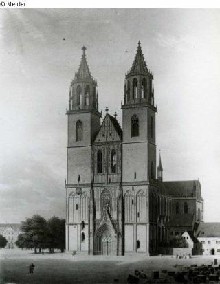 Fundmeldung Der Magdeburger Dom. Ansicht von Westen Hersteller/Künstler:in Hasenpflug, Carl Georg Adolph Objektart Zeichnung Material / TechnikBleistift / gezeichnetLost Art-ID302196