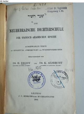 Fundmeldung Die Neuhebräische Dichterschule der spanisch-arabischen Epoche Autor:in Brody, H. u.a. Verlag Hinrich Objektart Buch Lost Art-ID632647