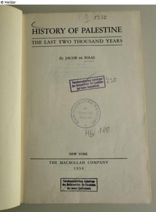 Fundmeldung History of Palestine. The last two thousand years. Autor:in De Haas, J. Verlag Macmillan Objektart Buch Lost Art-ID632698