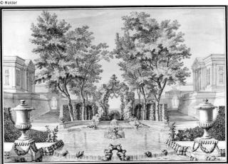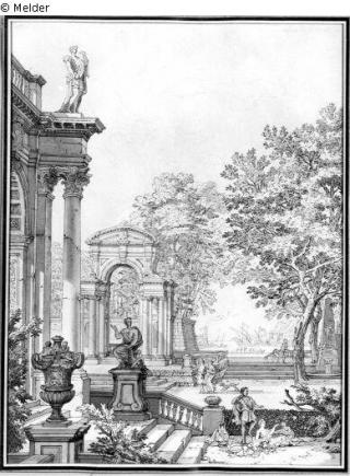 Fundmeldung Idealer Gartenprospekt mit Arkaden und Treppe Hersteller/Künstler:in Moucheron, Isaac de Objektart Zeichnung Material / Technikgezeichnet (Feder)Lost Art-ID220891