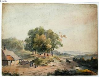 Fundmeldung Hügelige Landschaft mit Gehöft Hersteller/Künstler:in Schelfhout, Andreas Objektart Grafik Material / TechnikGraphit ; Farbe mehrfarbig / gezeichnet ; gezeichnet (Pinsel...Lost Art-ID584014