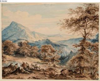 Fundmeldung Deutsche Landschaft mit felsigen Bergen und weitem Blick, im Vordergrund stattliche Eichen und eine Gruppe Lagernde Deutsche Landschaft mit felsigen Bergen und weitem Blick, im Vordergrund stattliche Eichen und eine Gruppe lagernder Zigeuner (historischer Titel) Hersteller/Künstler:in Scheuren, Caspar Joh. Nepomuk Objektart Zeichnung Material / TechnikPapier ; Bleistift ; Farbe braun, blau ; Eiweiß / gezeichnet...Lost Art-ID599830