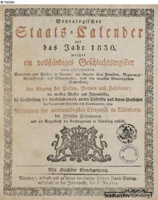 Fundmeldung Genealogischer Staats-Calender auf das Jahr 1830 welcher ein vollständiges Geschlechtsregister aller jeztlebenden Souverain und Fürsten in Europa, mit Angabe ihrer Familien, Regierungs-, Vermählungs- und Geburtsjahre, nach den neuesten Genealogischen Nachrichten; der Abgang der Posten, Bothen und Verlag Gustav Philipp Jacob Bieling Objektart Buch Lost Art-ID630900