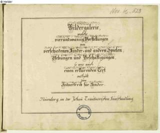 Fundmeldung Bildergalerie, welche vierundzwanzig Vorstellungen von verschiedenen Kinder- und andern Spielen, Uebungen und Beschäftigungen, so wie auch einen erklärenden Text enthält zum Zeitvertreib für Kinder Verlag Johann Trautner Objektart Buch Lost Art-ID630905