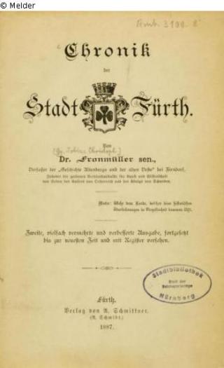 Fundmeldung Chronik der Stadt Fürth Autor:in Fronmüller, Georg Tobias Christoph Objektart Buch Lost Art-ID482151