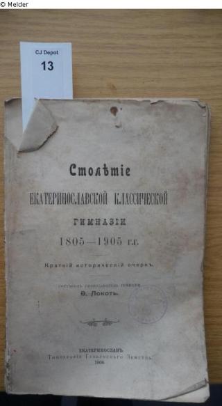 Fundmeldung Hundert Jahre Klassisches Gymnasium Jekatharinoslav. 1805-1905 Autor:in Lokot, Th. Drucker:in Bezirksdruckerei Objektart Buch Material / TechnikgebundenLost Art-ID452532