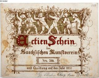 Fundmeldung Aktienschein des Sächsischen Kunstvereins, Nr. 310 Hersteller/Künstler:in Bosse, August Hermann Objektart Druckgrafik Material / TechnikPapier / gedruckt (Holzschnitt) ; koloriertLost Art-ID579172
