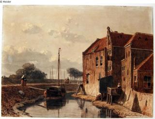 Fundmeldung Häuser an einem Kanal mit Treckschute Hersteller/Künstler:in Weissenbruch, Jan Objektart Zeichnung Material / TechnikGraphit ; Farbe mehrfarbig ; Papier / gezeichnet...Lost Art-ID584847