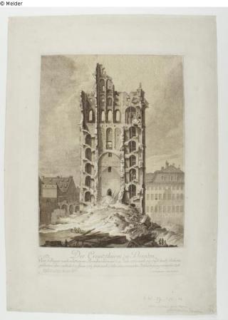 Fundmeldung Ruine des Turms der Dresdner Kreuzkirche am Altmarkt Hersteller/Künstler:in Holtzmann, Carl Friedrich Objektart Druckgrafik Material / TechnikPapier / gedruckt (Radierung) ; koloriertLost Art-ID583859