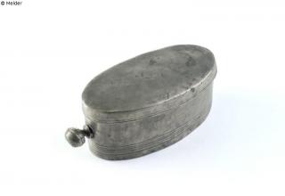 Fundmeldung Ovale Dose mit Deckel, Bratwurstdose Hersteller/Künstler:in Unbekannt (vermutl. Nürnberg) Objektart Behältnis Material / TechnikMetall (Zinn) / gegossen ; gelötet ; eingraviertLost Art-ID578018