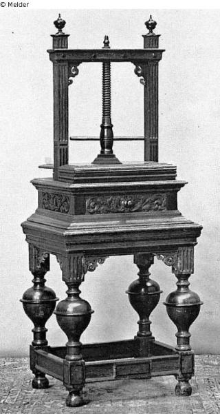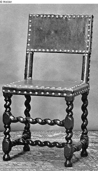 Suchmeldung Stuhl mit vier Säulenförmigen Beinen mit Lederbezug und Kupfernägeln Objektart Möbel Material / TechnikHolz (Nussbaum)Lost Art-ID319698