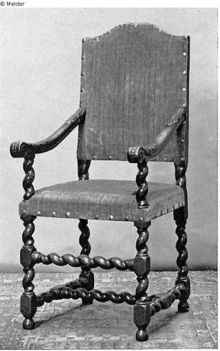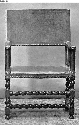 Suchmeldung Stuhl mit gedrehten Beinen mit Querverbindungen und genageltem Lederbezug Objektart Möbel Material / TechnikHolz (Nussbaum)Lost Art-ID319699