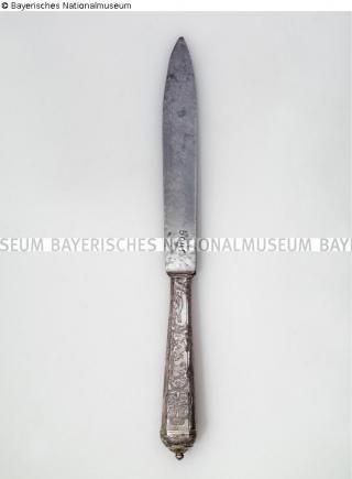 Fundmeldung Messer, Griff mit Jagdszenen und dänischem Königswappen Hersteller/Künstler:in Baus, Johann Peter / Baus, Peter Daniel Objektart Kunsthandwerk / -gewerbe Material / TechnikMetall (Silber) ; Metall (Eisen) / graviertLost Art-ID570400