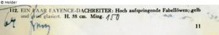 Suchmeldung Ein paar Fayence-Dachreiter: Hoch aufspringende Fabellöwen Hersteller/Künstler:in Unbekannt Objektart Kunsthandwerk / -gewerbe Material / TechnikKeramik (Ton) ; Glasur (Fayence) gelb, grünLost Art-ID582756