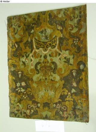 Fundmeldung Goldledertapete mit Baldachin, Blütendekor, Schleifen und Vase Hersteller/Künstler:in Unbekannt (Niederlande) Objektart Kunsthandwerk / -gewerbe Material / TechnikLeder gold ; Lack gold ; Lüsterfarbe rot, grün / geprägt...Lost Art-ID620724