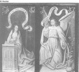 Suchmeldung Maria der Verkündigung (Flügelaußenseite eines Altärchens) Hersteller/Künstler:in Unbekannt (Niederländisch) Objektart Malerei Material / TechnikTempera [?] ; Holz (Eiche) / gemaltLost Art-ID105807