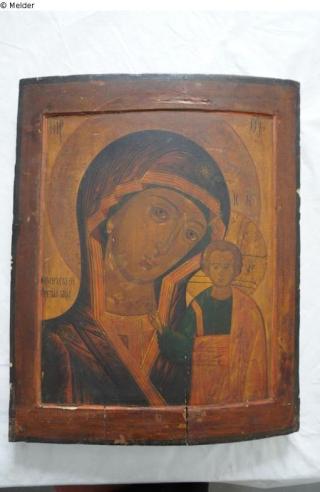Fundmeldung Ikone Maria von Kasan Hersteller/Künstler:in Unbekannt Objektart Gemälde Material / TechnikFarbe ; Holz (Birke) ; Holz (Pappel) / gemaltLost Art-ID613800