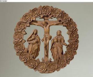 Fundmeldung Christus am Kreuz im Rosenkranz / Kreuzigungsgruppe Hersteller/Künstler:in Unbekannt (Süddeutsch / Oberbayern) Objektart Relief Material / TechnikHolz (Linde) / geschnitzt ; abgelaugtLost Art-ID578127