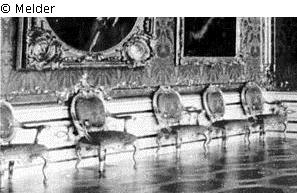Neues Palais, Unteres Fürstenquartier Hofseite, Rote Damastkammer (Raum 164). Verlustgeschichte: 1944 nach Schloss Rheinsberg verlagert, seit der Besetzung durch die sowjetische Armee verschollen (siehe Verlagerungsliste Brandenburgisches Landeshauptarchiv, Potsdam).