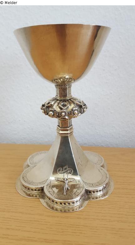 Sechspassfuß, die sechs Rotuln am Nodus/Knauf in Form von Blumen; am Schaft ober- und unterhalb des Nodus umlaufende Inschriften „ihesus“ und „maria“; auf der Unterseite des Fußes Inschrift mit Stifter "wopeld(esche)", Datum "1493" und der Angabe "23 Lot", auf dem Fuß eine im 17. Jh. ergänzte Platte mit weiterer Stifter-Inschrift „H Barthol Moller B“ (Hamburger Bürgermeister Barthold Moller 1605-1667) und dessen Wappen.