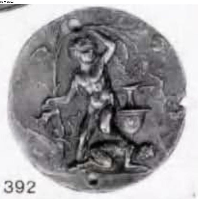 Bange-WV, Nr. 392 (Α. N. 7 1 1 . Inv. 1053.) Titel: Allegorie der Verleumdung. Ein stehender Knabe, nur mit einem dünnen Schleier bekleidet, hat den linken Fuß auf einen am Boden kauernden Satyr gesetzt. Mit der Rechten begießt er aus einer Kanne ein abgestorbenes Bäumchen, während er den aus derselben Wurzel emporwachsenden großen, geflügelten Baum, dessen Krone Lorbeer- und Eichenzweige, Blumen und Fruchtknospen trägt, mit der Linken herabreißt. Außerdem bläst von rechts ein Windgott in die Krone des gewaltsam gebeugten Baumes; um Wurzel und Stamm windet sich eine Schlange. Rechts von dem Knaben eine geschlossene Deckelkanne und ein Bäumchen, an dem ein Henkelgefäß hängt. Halbrelief. Bronze. Rund und leicht konvex. Dm. 5 cm. Am Rande durchbohrt;