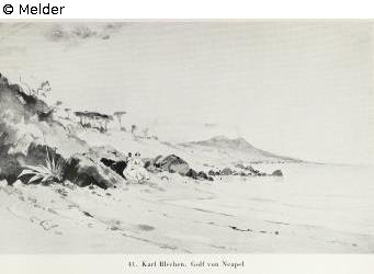 Ansicht des Golfes von Neapel, mit zwei sitzenden Damen, im Hintergrund der Vesuv. Links in der Mitte bezeichnet: Blechen. Verzeichnet bei J. Kern: Karl Blechen St. 178 und farbig abgebildet in Deutsche Skizzenmappe der Marées Gesellschaft. Ausgestellt in der Kunsthalle Bern Mai/Juni 1940. Gerahmt.