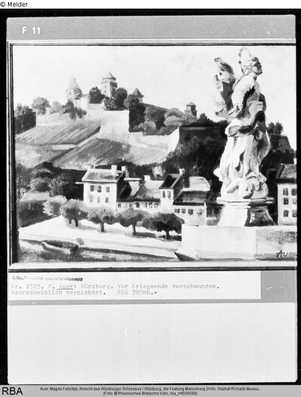 Suchmeldung | Einzelobjekt Ansicht von Würzburg Ansicht des Würzburger Schlosses / Festung Marienberg Lost Art-ID585377 Vorherige Weiter Hersteller/Künstler:in Auer, Magda Felicitas Geburt 1902.12.03, Köln Tod 1990.02.23, Köln TitelAnsicht von WürzburgZusatztitelAnsicht des Würzburger Schlosses / Festung Marienberg Datierung1900 (nach)ObjektartMalereiObjektgruppeMalereiMaterial / TechnikÖl ; Leinwand [?] / gemaltAbmessungen54 x 73 cm InventarnummerWRM 2525Beschreibung Signatur unten rechts: "Auer". Weiterlesen Weniger anzeigen Provenienz 1936 Wallraf-Richartz-Museum, Köln. Seit 1945 Verbleib unbekannt. Weiterlesen Weniger anzeigen Veröffentlicht seit30.01.2020 Kontakt Wallraf-Richartz-Museum & Fondation Corboud Obermarspforten 50667 Köln Deutschland Tel+49(0)221/221-22372Fax+49(0)221/221-22629Homepagehttp://www.wallraf.museum Ansprechpartner:in Dezernat für Kunst und Kultur der Stadt KölnPositionMuseumsreferat, ProvenienzforschungTel+49(0)221/221-22520E-Mailprovenienzforschung@stadt-koeln.de