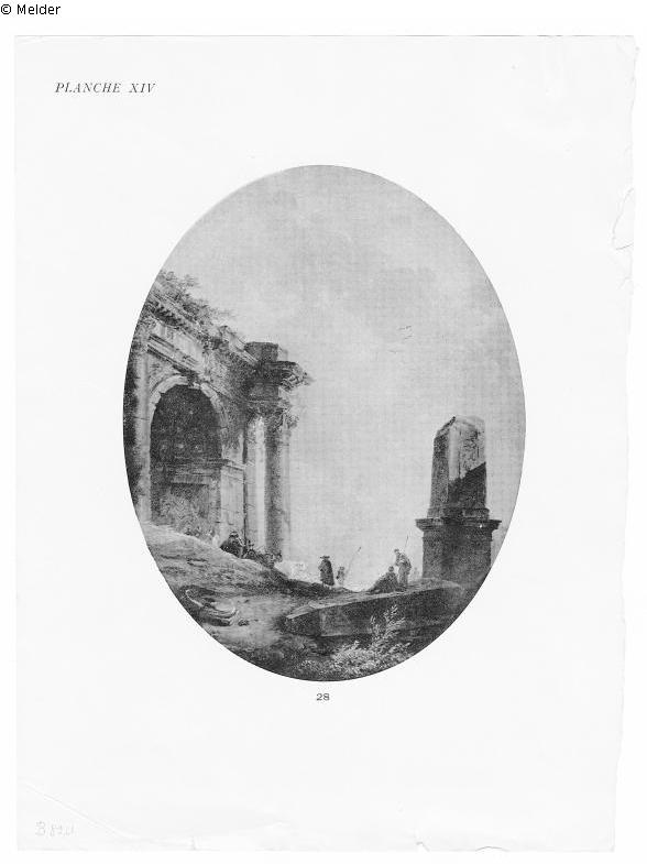 Oval, auf der Rechten erhebt sich der abgebrochene Schaft eines Obelisken am Fuße eines Pfades. Auf der Linken ein Triumphbogen, durch den eine Viehherde von einem Schäfer getrieben wird.
