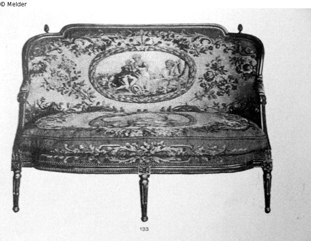 Sofa und sechs Fauteuills. Die geschnitzten und vergoldeten Gestelle auf runden, kannelierten Füßen mit Rosettenquadern, auf Zargen, Lehnen und Randleisten Palmetten-Dekor, auf den Pfosten der Rückenlehnen Pinienzapfen. Der Fond der Bezüge hell-olivegrün