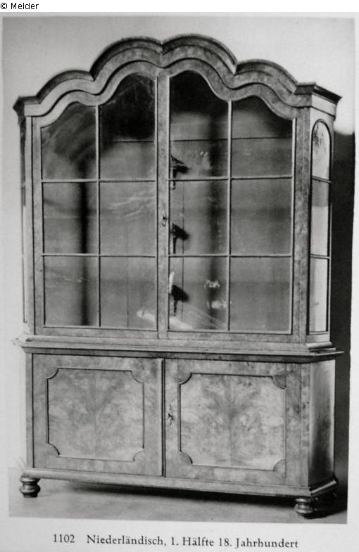 An den Seiten abgekantet, unten und oben zwei Türen, der Aufbau mit Glas (nachträglich) und geschwungenem Sims.