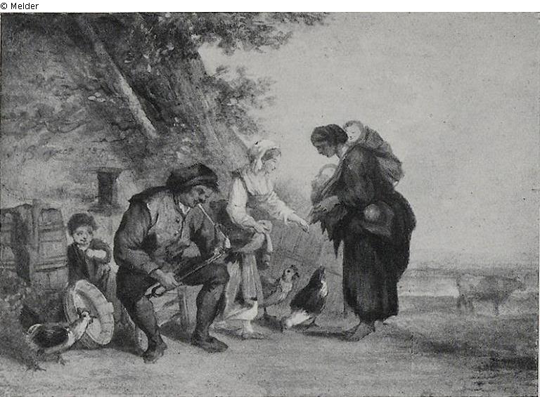 eine ärmlich bekleidete Frau mit Kind rechts; links oben bezeichnet: J.B. Huet 1787; Gegenstück zu Bäuerliche Familie im Freien ruhend mit Kindern spielend
