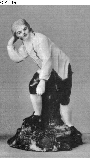 Er steht breitbeinig mit gebeugtem Bein und vornübergeneigtem Oberkörper, läßt den linken Arm lose herabhängen und rauft sich mit der rechten Hand das Haar. Der Gesichtsausdruck ist halb ärgerlich, halb verlegen. Er trägt lichtbraunes Haar mit lockigen Strähnen, weißes Hemd, goldbordierte, offene weiße Jacke ohne Knöpfe, an den Ärmeln, an der Seite und hinten geschlitzt, schwarze Kniehosen, weiße Strümpfe und schwarze Schuhe mit braunen Sohlen. Der scharfkantige Felssockel und die Felsstütze sind braun staffiert, an einzelnen Stellen grün und graublau. Das Motiv ist wohl dem Stich nach Pater, "Le Baiser donné", entlehnt. Der jungverheiratete Bauer muß es mit ansehen, wie der Herr seine Frau küßt. Ohne Marke. (Die sechsspeichige eisenrote Radmarke im Innern des glasierten Sockels ist zweifellos später hineingemalt und eingebrannt.) Ritzzeichen. Südwestdeutsch. Ein Fuß angekittet.