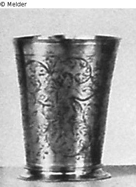 Konische Form auf profiliertem Fuß . Die Wandung reich graviert mit Putten in Blumen- und Blattwerk. Augsburg. Augsburger Beschau- und Meistermarke C.S. (Chr. Schwaiger). Gew. 300 g.