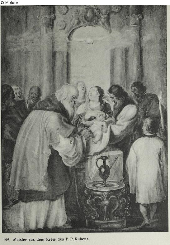 Renaissance-Rotunde mit großer Fensteröffnung hinten, zu der die Heiliggeisttaube hereinschwebt. Die Eltern des Kindes halten es über einen Tisch einem alten Priester entegegen, der die rituelle Handlung an ihm vornimmt. Hinter dieser Gruppe links und rechts vier Männer und eine Frau; rechts vorn Levitenknaben neben niedrigem Opfertisch mit Kanne. Quelle: Hugo Helbing Kunsthandlung und Kunstversteigerungshaus: Kunstbesitz eines Berliner Sammlers. Katalog Nr. 49; Math. Lempertz'sche Kunstversteigerung: Eine bekannte Süddeutsche Privatsammlung und anderer Privatbesitz, Katalog Nr. 395. (DOI: Externer Link) (DOI: Externer Link)